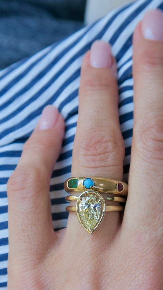 A Lab-grown emerald set with a round turquoise and rhodolite in a gently curved band.